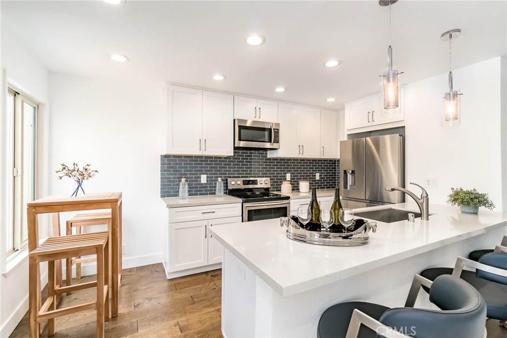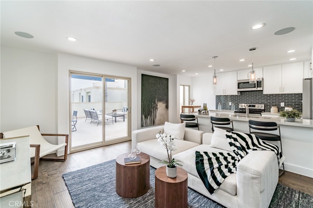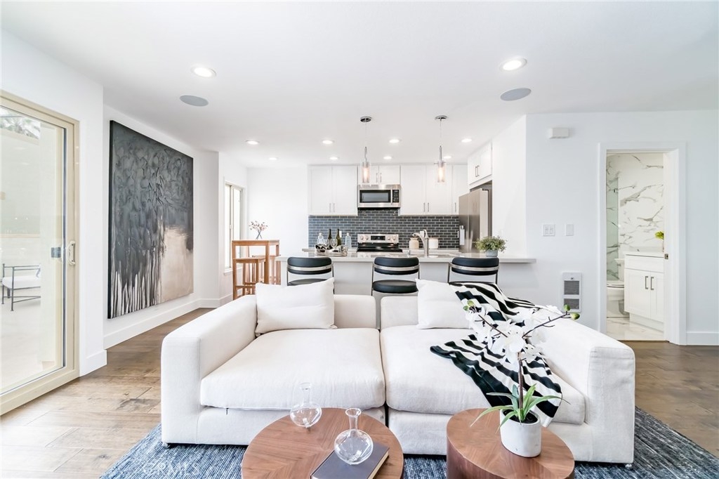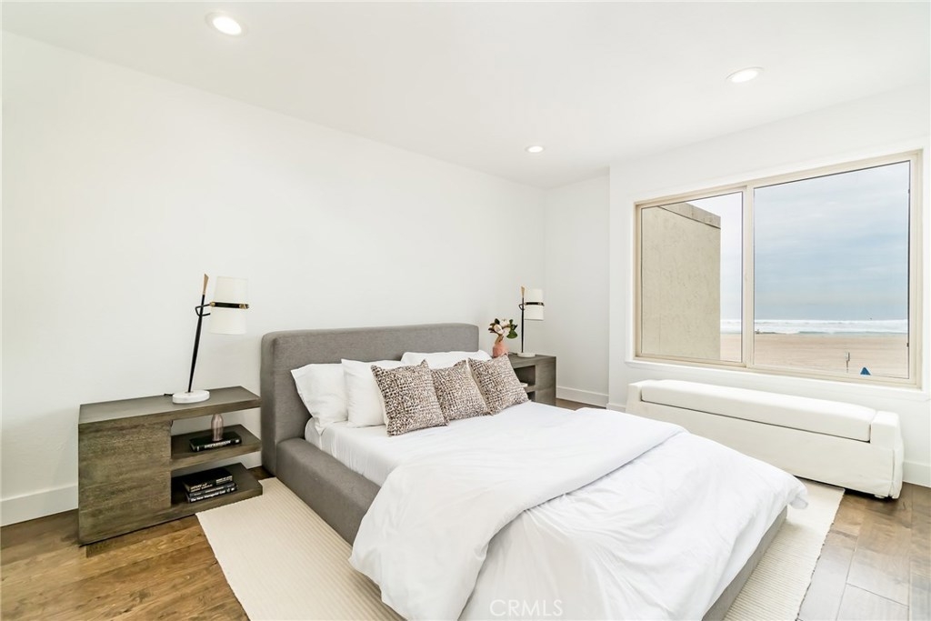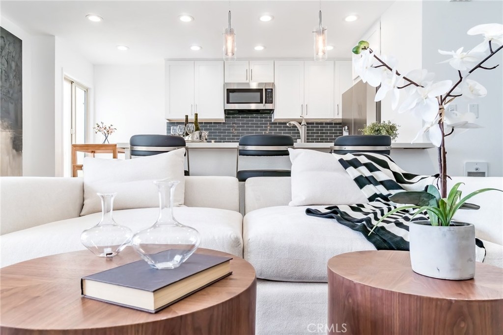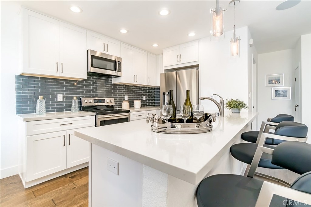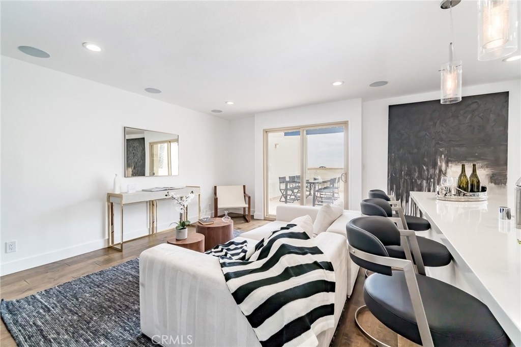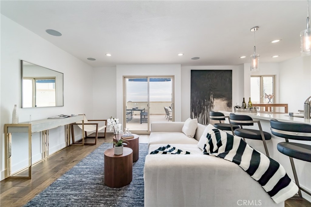 Rare opportunity to own a unique Totally-Remodelled condominium with 500 square foot entertainers deck.This two bedrooms, two full baths, 968 square foot of living space features Custom Kitchen Cabinetry, Stainless Steel Appliances, Peninsula Island,White Carrera Marble Top, Audio Home System, Dining area overlooking Catalina Island & Views -Views- Views! The sunny 500 square foot entertainers deck is one of only eight private decks in the development.Few minutes walk to downtown Huntington Beach, restaurants and shops.This is a rare find not just in this complex but along the coast. As a resident, you are allocated one private and secured parking space, a private storage unit, and 24 HR security.The community pool, clubhouse, barbeque area, private access to the beach allow you a respite, a place to savor the finest amenities and enjoy the prestigious community.
