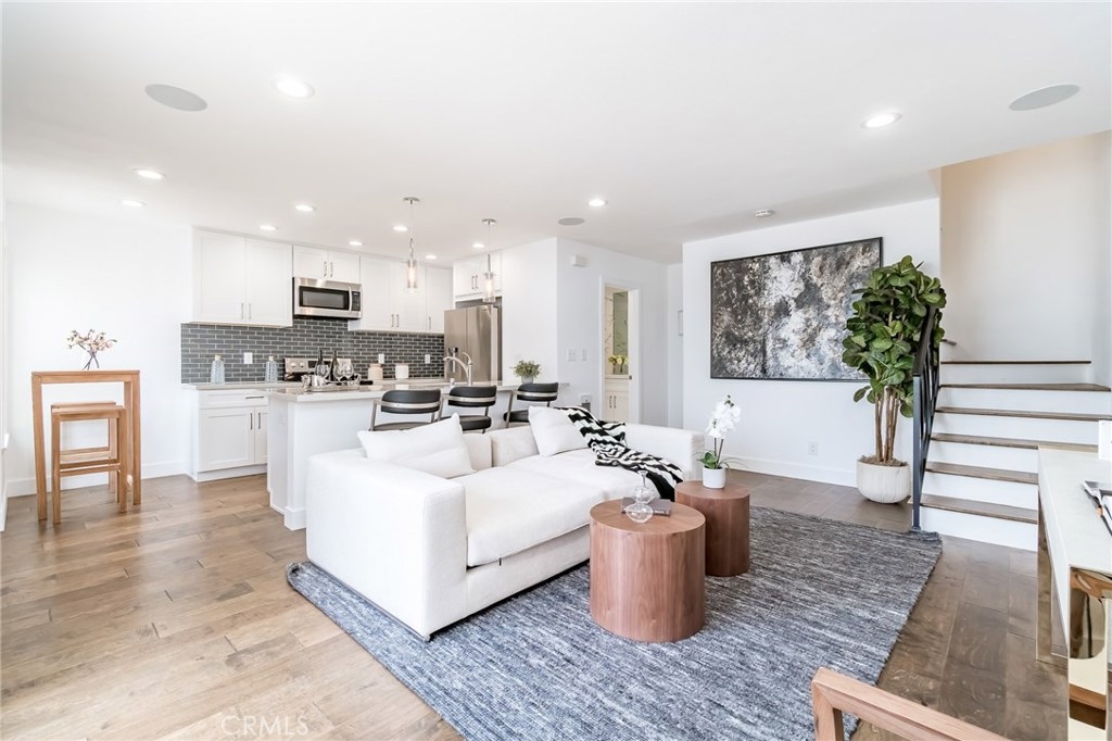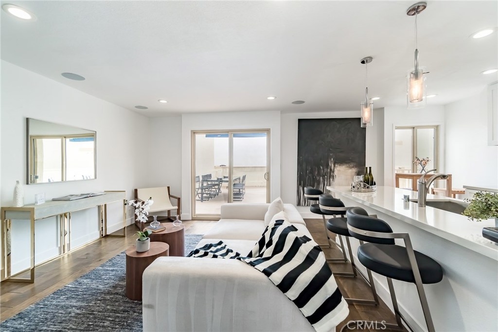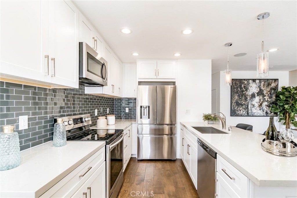 Rare opportunity to own a unique Totally-Remodelled condominium with 500 square foot entertainers deck.This two bedrooms, two full baths, 968 square foot of living space features Custom Kitchen Cabinetry, Stainless Steel Appliances, Peninsula Island,White Carrera Marble Top, Audio Home System, Dining area overlooking Catalina Island & Views -Views- Views! The sunny 500 square foot entertainers deck is one of only eight private decks in the development.Few minutes walk to downtown Huntington Beach, restaurants and shops.This is a rare find not just in this complex but along the coast. As a resident, you are allocated one private and secured parking space, a private storage unit, and 24 HR security.The community pool, clubhouse, barbeque area, private access to the beach allow you a respite, a place to savor the finest amenities and enjoy the prestigious community.