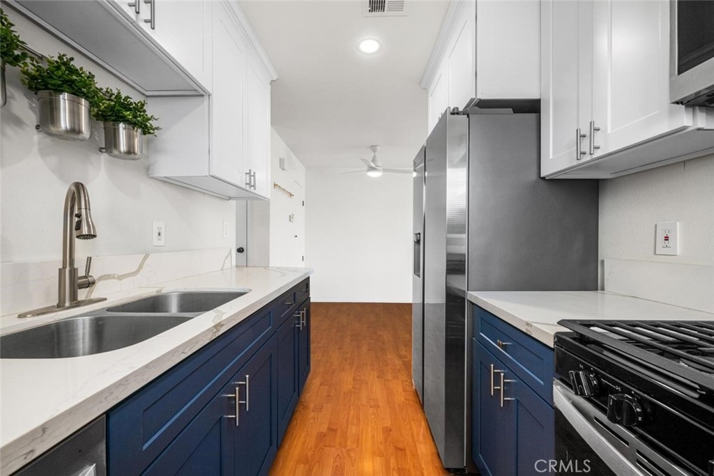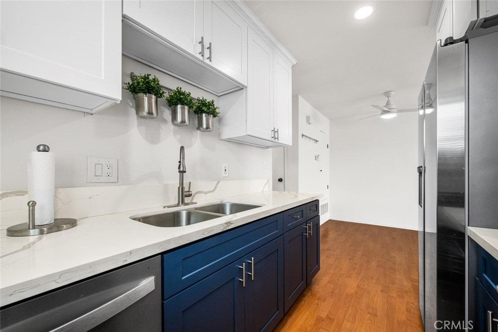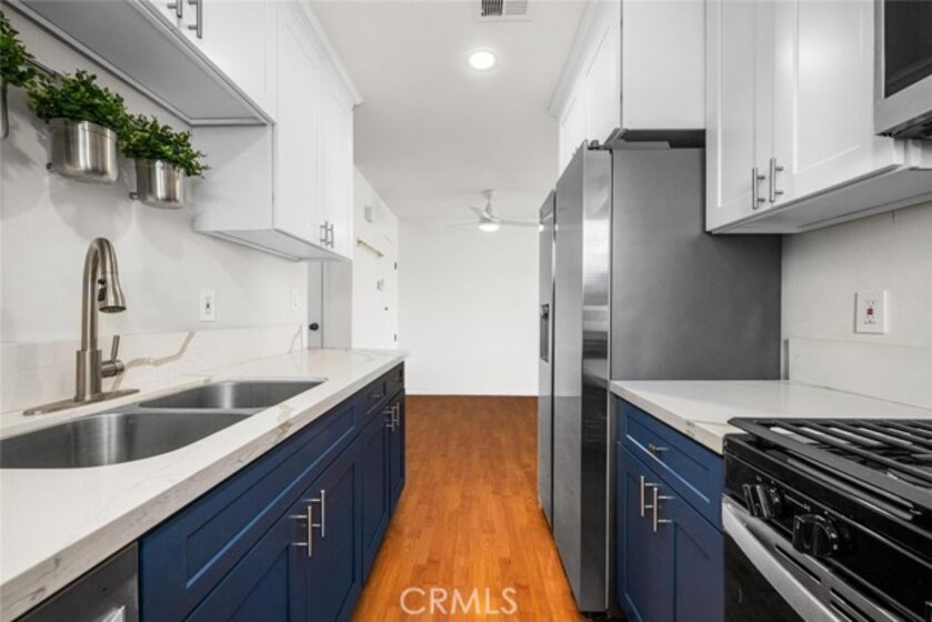 Welcome to this newly updated 2 bedroom/1 bath condo in the heart of Huntington Beach! Upper end unit shows light & bright and is tucked away in a quiet neighborhood with interior location. You’ll enjoy the open floor plan with dual-pane vinyl windows, laminate flooring, ceiling fans, ample storage/closet space, and a private balcony. The modern galley kitchen offers quartz countertops, a gas range, stainless steel appliances and self-closing cabinets. Bathroom has new vanity, mirrored medicine storage cabinet, and a reglazed tub. The complex offers green belts, a pool, basketball court, picnic area, plenty of parking and low HOA dues. Centrally located to downtown Huntington Beach, the Pier, restaurants, coffee spots, shopping, and convenient freeway access. Come see all that this turnkey condo, that’s close to the coast, has to offer!