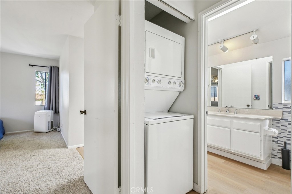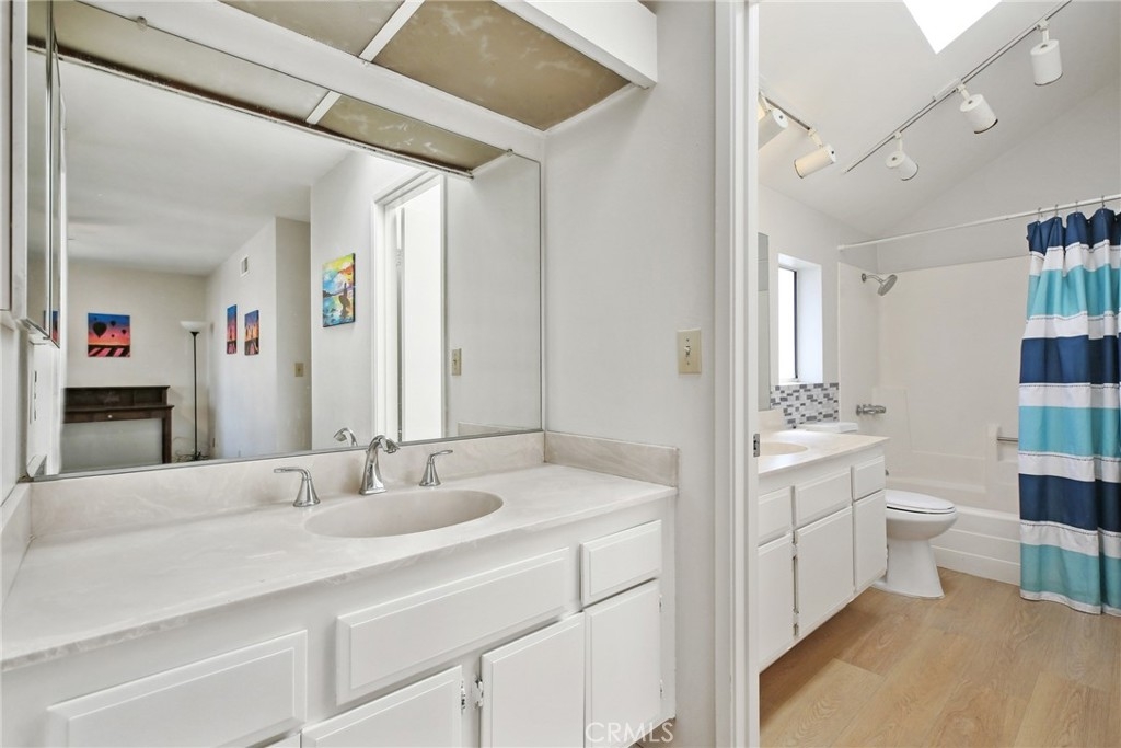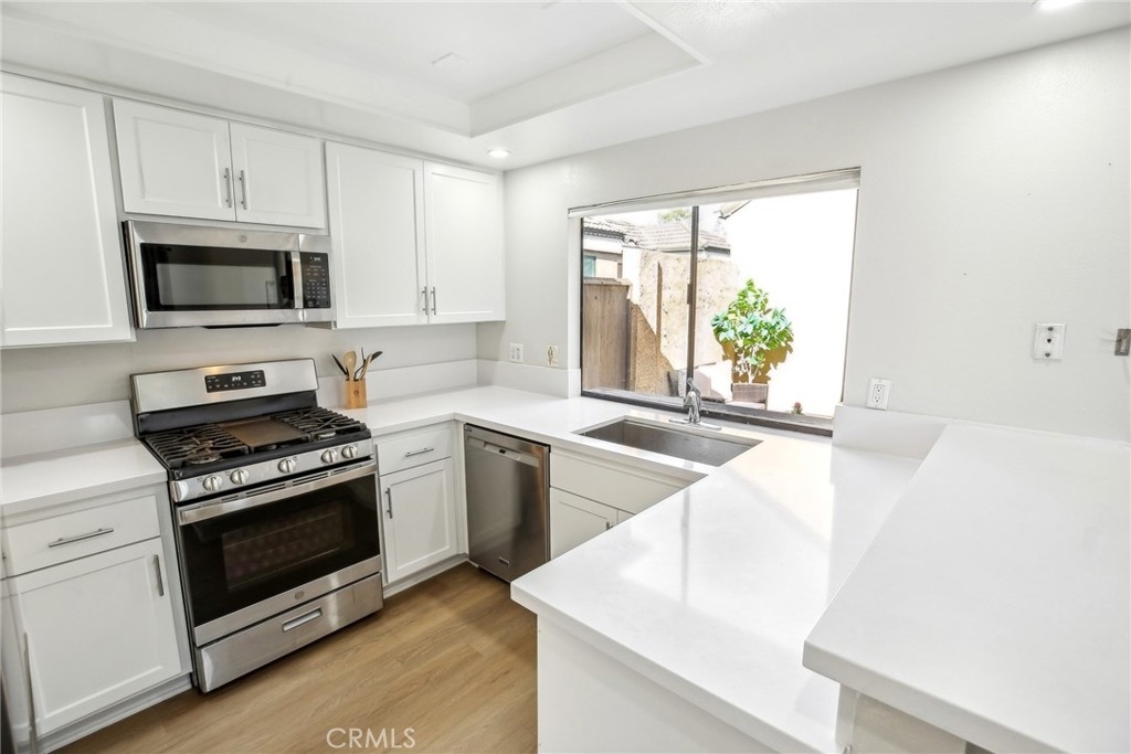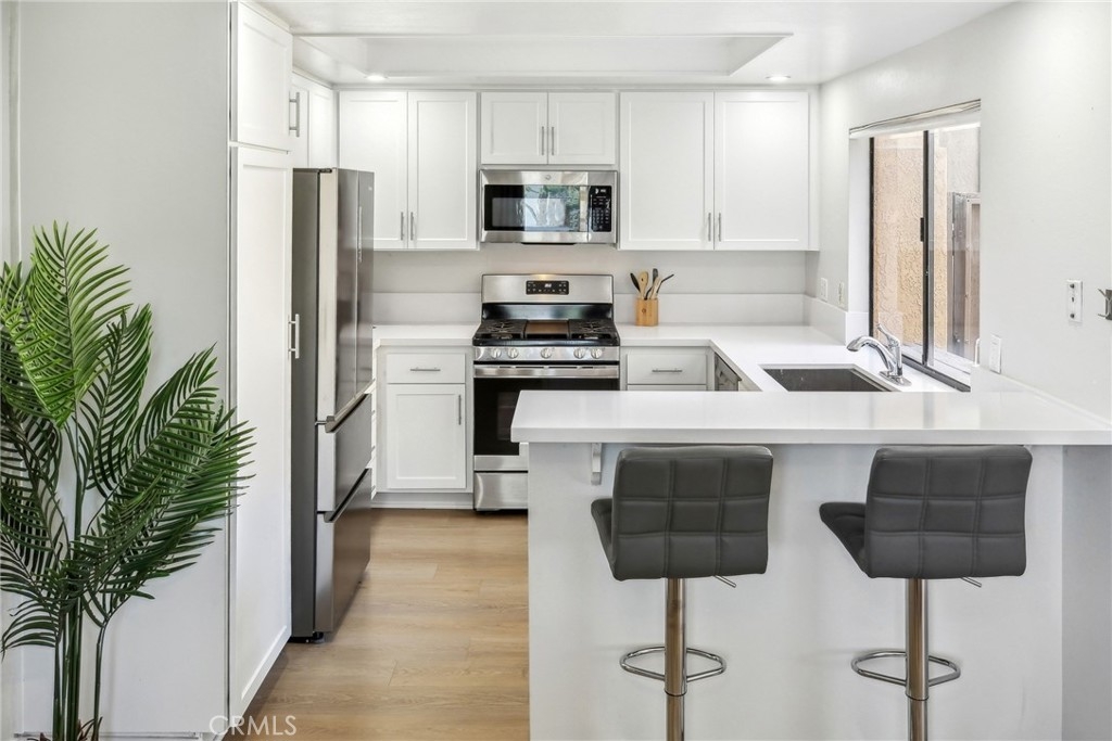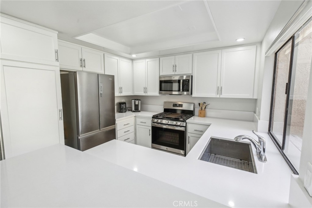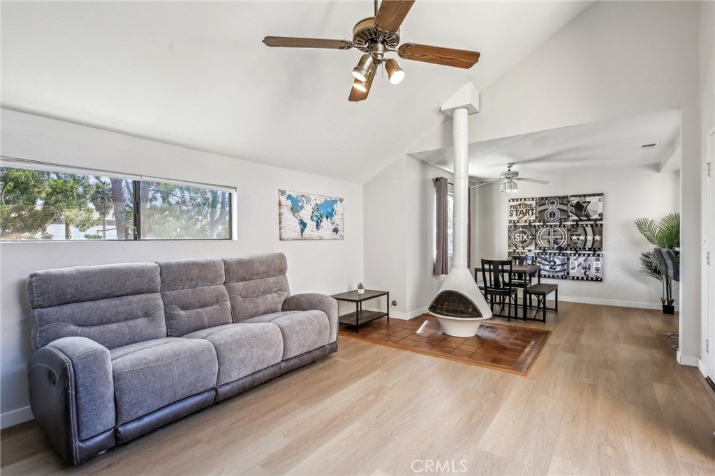 Welcome to the Millstream Community! This beautiful second level condo with 971 sq. ft. of living space boasts an abundance of natural light in every room. The home features two spacious bedrooms and one and a quarter bathrooms (other units have converted the 1/4 bath to a 3/4 bath), a large private gated patio, and a single car detached garage! As you enter the home, you are greeted by a cozy free standing fireplace, vaulted ceilings and luxury vinyl flooring. The kitchen was remodeled in 2023 with all new cabinetry, quartz countertops and stainless steel appliances. The primary bedroom features a large walk in closet and its own private sink area, and the secondary bedroom has mirrored closet doors. The stackable washer and dryer are conveniently located inside the unit and are included in the sale. There was also a new furnace installed in 2022 and a new water heater in May of 2023. Skylights and lots of windows give this unit a light and bright atmosphere. You will love the scenic pathways of this community with meandering streams and gentle waterfalls. This amazing gated community also offers a sparkling pool, soothing spa and a well maintained tennis court. There is plenty of guest parking throughout the community with no permits needed. In addition to being in close proximity to shopping, restaurants, and entertainment, this community is 5 minutes to the freeway and 10 minutes to the beach! You don’t want to miss this one!!!