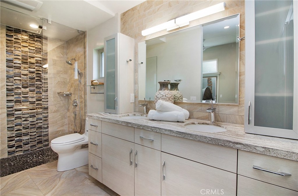 For the DISCRIMINATING BUYER who wants it all and not the hassle and stress that comes with it. This is the ultimate in remodel and location. Top of the line everything. Never meant to be sold. Located facing clubhouse on green belt--one of the most desirable locations. Save yourself months of remodeling, HOA approvals and mandatory changes, working with city inspectors and getting permits, putting up with stop work orders, etc. This Breakers model allows the kitchen to be opened to the Living Room and Dining Area for a wonderful GREAT ROOM. It required removing bearing walls, engineers, etc. but the end result was worth the effort. Newer dual pane windows, furnace, air conditioner, skylights, solar tubes, STEAM SHOWER in Master Bath, functional handicap rails installed in both bathrooms serving as trays plus fold up seat in Master WALK IN Shower. The decor is top of the line chosen with a designer. Quartz counters, beautiful back splash tile, beautiful custom cabinets in kitchen carried into dining area for extra storage. Top of the line hardware and faucets, solid core doors, all appliances included--even inside washer and dryer plus refrigerator. Vaulted ceilings, luxury vinyl floors in all but master, tall baseboards, wonderful atrium open to dining area and master plus patio off of bedroom/office #2. Scraped ceilings, recessed lighting throughout. Even the electrical panel was upgraded. You have to see this one to believe it. NOTHING LIKE IT!!! 55+ COMM.
