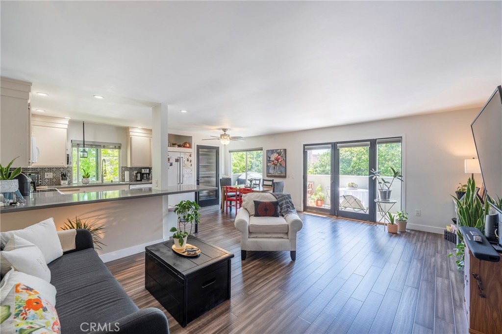 Discover resort-style living in the Huntington Landmark Community, a 24-hour guard-gated enclave just a mile from the beach, complete with heated pools, tennis courts, and extensive recreational facilities. This desirable end unit features an open concept with a completely remodeled kitchen including quartz countertops, newer appliances, and a mosaic tile backsplash, alongside a modernized bathroom with a vessel sink and tiled shower-tub combo. The spacious primary bedroom includes mirrored wardrobes, with bamboo floors and dual pane windows enhancing the home throughout. A private patio with an electronic sunshade offers a serene retreat, making this one-bedroom, one-bath home the perfect blend of luxury and coastal convenience.