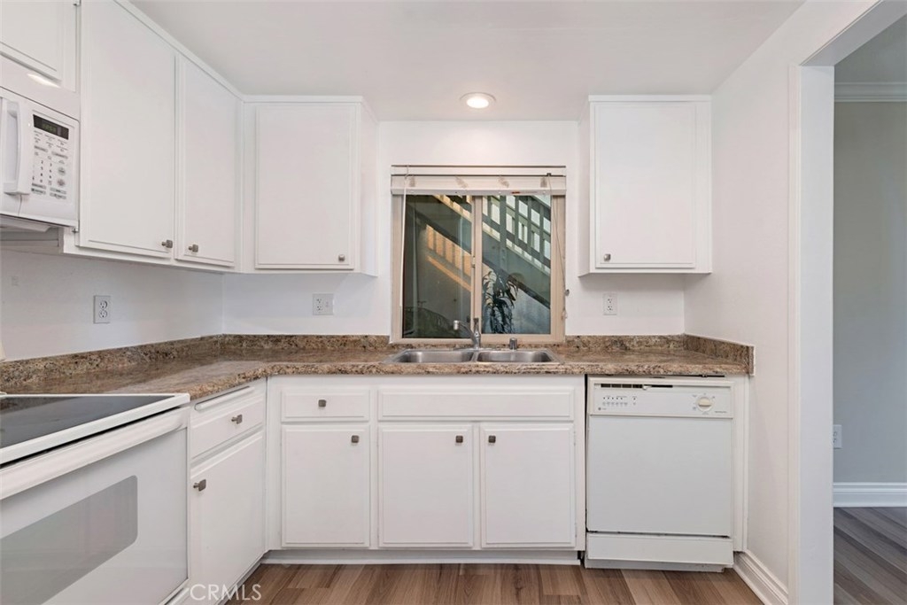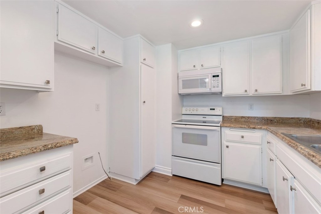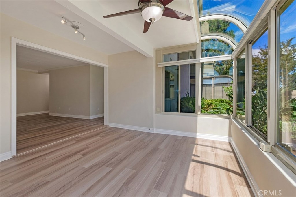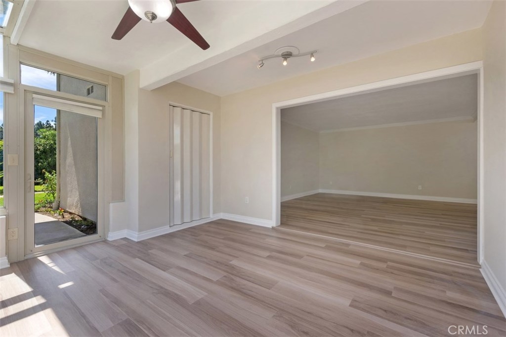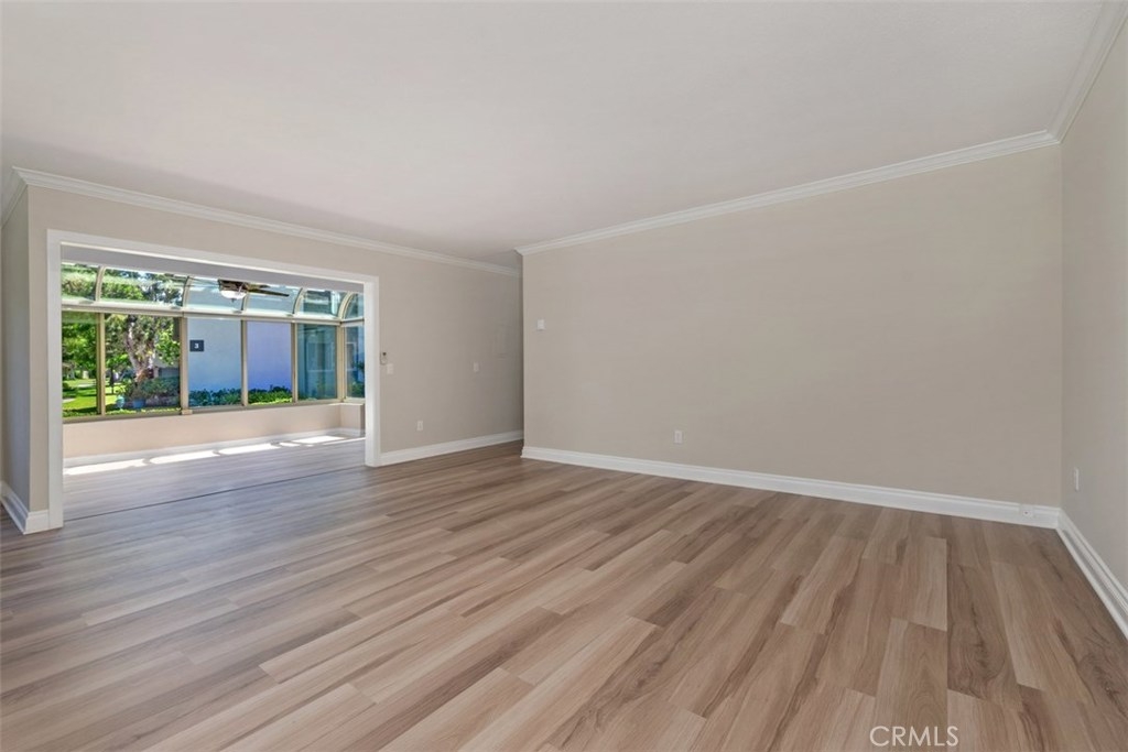 Fantastic, ground level, end unit situated in the delightfully ocean close, guard gated Huntington Landmark 55+ community. This light and bright 1 bedroom condo, features wide plank flooring and double paned windows throughout. The large master bedroom offers plenty of space and has customized built in cabinets in the walk in closet. Enjoy the Four Seasons enclosed patio and extended living area off of the living room, which suits well as an office, den or guest room. Fresh paint throughout, stackable washer/dryer included. Situated in a prime location of the community, across from the club house, but set back from the street with extensive greenbelt views. Comes with 1 car garage in prime location, complete with extra built in storage. Amenities in Huntington Landmark community include, 2 pools2 spas, putting green, tennis court, gym/weight room, billiards rooms, wood shop, shuffleboard, library, various classes/events, ceramics &fitness classes, trips, clubs, dances & bingo and so much more! Must be 55+ years old. Truly a wonderful community for active seniors. Don't miss your chance to secure this wonderful property.